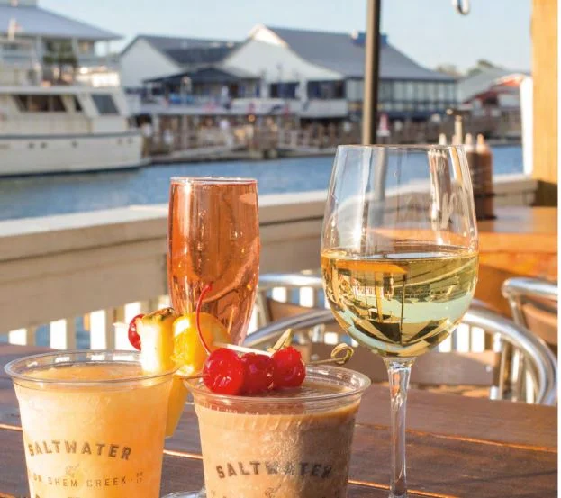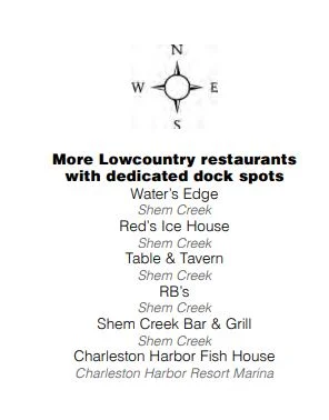 Creek classic Vickery’s is a community standby, with sand and tiki torches at its lowerlevel Muddy’s Dock Bar and dining space framed by palm fronds upstairs. We love the Rum Chum cocktail and the Bourbon Butter Shrimp. While Vickery’s doesn’t have dedicated dock space, the picturesque boardwalk to and from Shem Creek Park provides plenty of opportunity to zen out and observe marsh life.