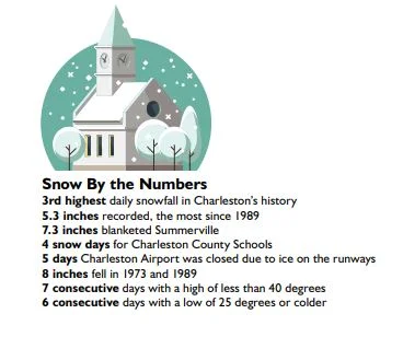 Some island residents will recall the last significant snow; December 22, 1989, almost three months to the day after the Category 5 wrath of Hurricane Hugo hit Isle of Palms and Sullivan’s, destroying the islands’ way of life as we knew it. That year a white Christmas was Mother Nature’s gift following her earlier destruction. Eight inches of snow blanketed Charleston, temporarily obscuring the devastation that lay beneath.