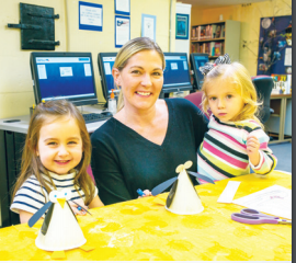 Molli LeMin and her daughters Evelyn and Sylvia pose with their penguins at the Poe Library Earth Day craft event.
